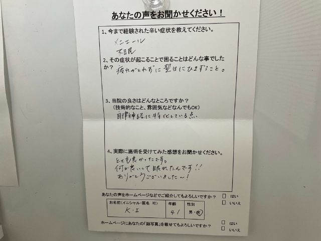 めまいで外出できませんでしたが施術後は頭がスッキリ!感謝しかありません!